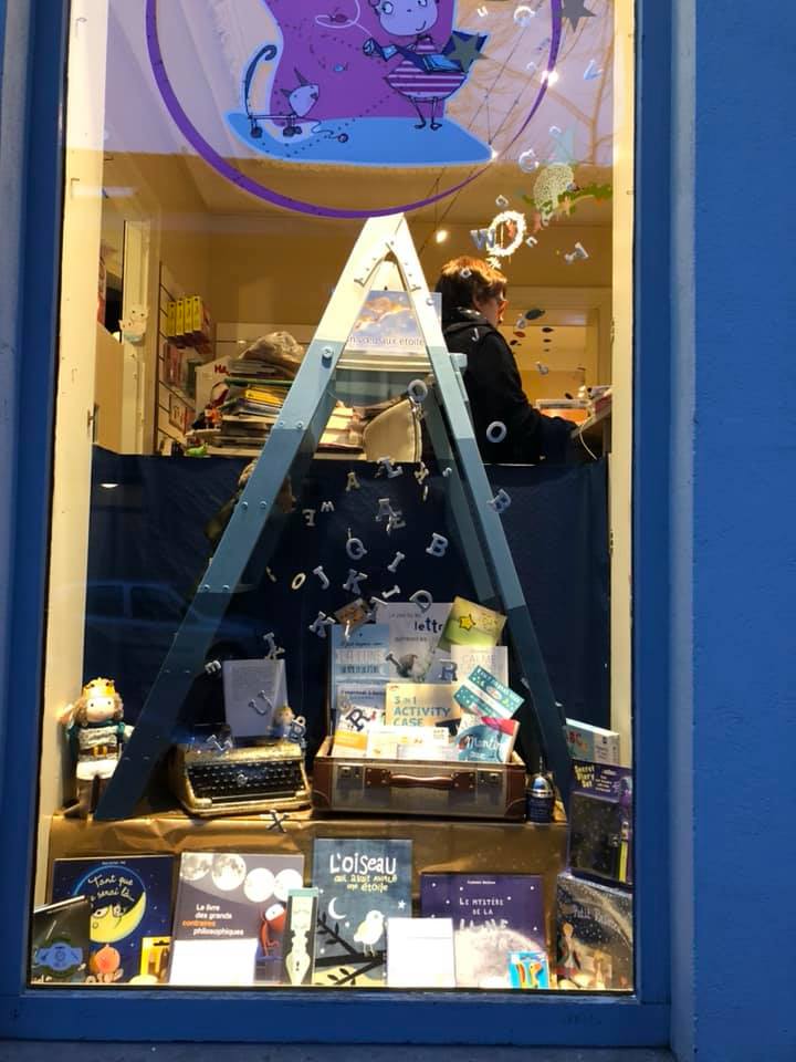 • Vitrine de gauche : Composition en triangle / contraste clair-obscur / Accumulation d’objets en lien avec l’écriture et la poésie / Envolée de lettres vers les étoiles / Inspiration de la citation suivante : « il faut toujours viser la lune car même en cas d’échec on atterrit dans les étoiles ».